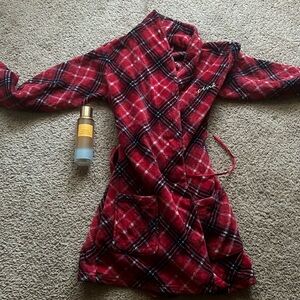 This is a pink/vs robe with a belt and a perfume. The perfume has only been used once and the robe is in excellent condition and barely been worn