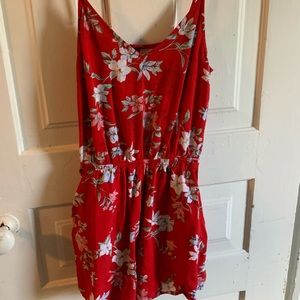 Red flowery romper from H&M! Small, barely noticeable dark red stain on front. I still wore it with that there, not sure what it even is. Size 2. also, it has pockets!!