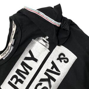 UGH... this is sooooo RAD! Black tunic dress in soft light cotton with rolled sleeves and elastic waist. The white spray paint cans with logo are obviously rad! Little white, pink, green and blue ribbon stripes on the sleeves just make it extra. Get this styled piece in your bundle with some leggings, kicks and jacket for a styled closet discount! EUC.