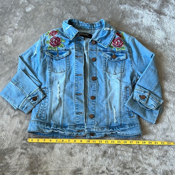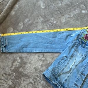kids medium jean jacket with embroidered roses. i’m 17 years old and it still fits me :)