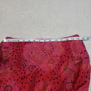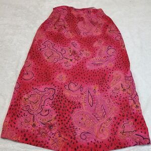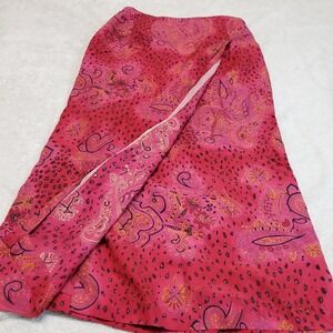 Straight lined skirt with a side zipper, wrap style in front. The iron on adhesive has started to come apart a bit as shown in photo #2.