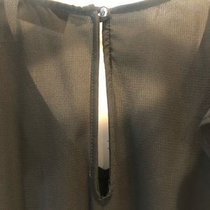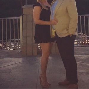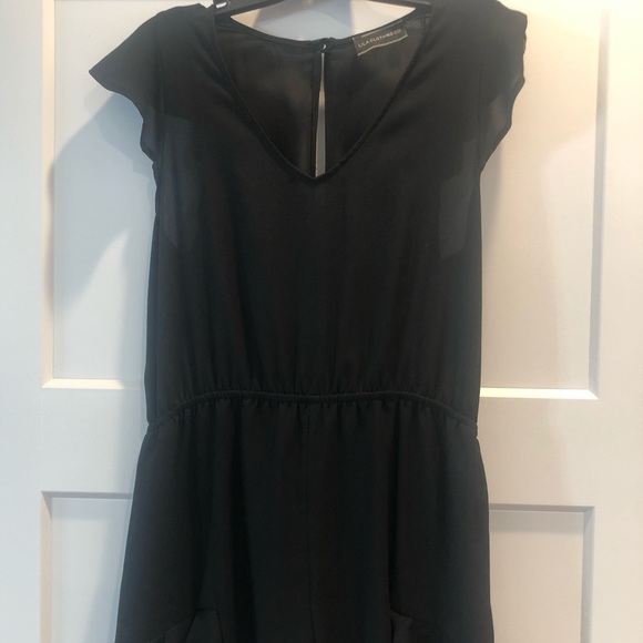 Flirty, fun, and fluttery! The ruffle details makes this romper. It is not see through. The material is polyester. It is 32 inches long. Can be dressed up or down and is perfect for a bachelorette party. Button back detail. Ruffles on bottom of both legs and shoulders. Elastic waistband making it even more flattering. Excellent used condition! Smoke free home.