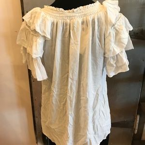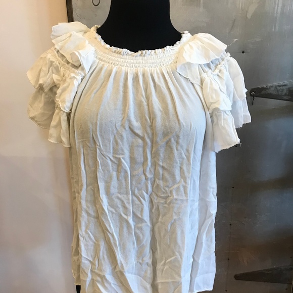 White blouse with sinched neck line & ruffled sleeves