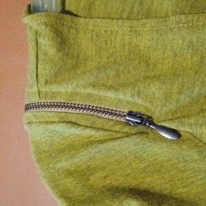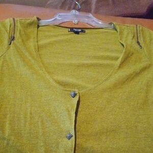 Stylish mustard yellow cardigan with zipper details. Perfect for layering.