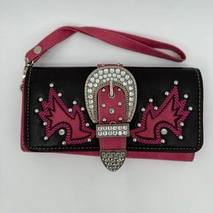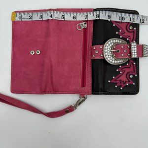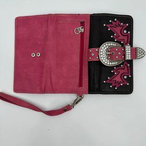 - brown and pink studded belt buckle wallet