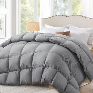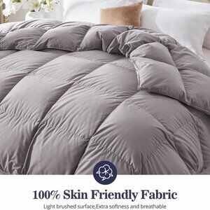 [SUPREME COMFORT & INSULATION] Our down comforter is filled premium white down and feather with 3D-BOX temperature locking cabin design, where each individual square is designed to hold a greater amount of down and air.This design not only keeps you warm without overheating,but also keeps down lofty and distributed for cozy, fluffy, and nicely breathable without shift.This combination creating a perfect balance of fluffiness, and warmth. Experience unparalleled comfort during the night.