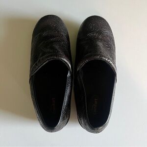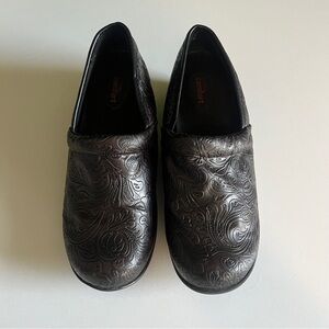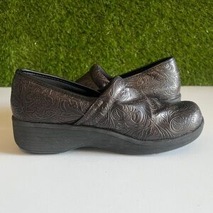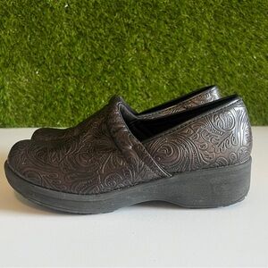 Listing is for a pair of safeTstep size 9 dark brown work shoes/clogs with an embossed paisley and floral design!