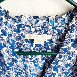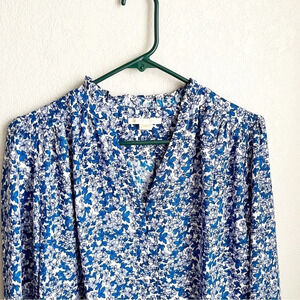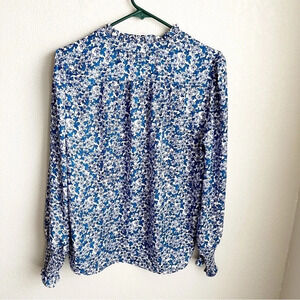 DETAILS: Cooper & Ella size small. Blue small ditsy floral. Fabric covered buttons in button down style. Ruching at shoulders. Smocked detail at cuffs. Polyester, machine wash.