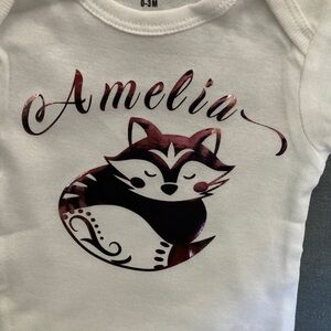 Adorable one-piece bodysuit customized with a fox and the name Amelia