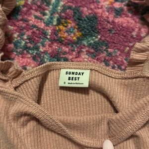 worn once. the sleeves are ruffles, they look bad in the pic but once it’s on you, you can fix them to be ruffles!