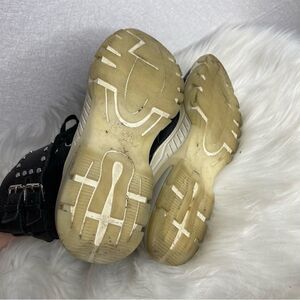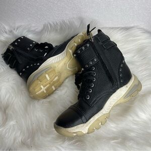 •Features: Black pebbled leather high top studded combat boots. Sneaker like sole. Lace and zip closure.