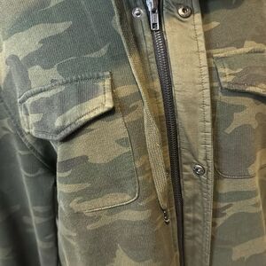 sanctuary (Anthropologie) camo hidden front zipper (snap placket) layered raw edge ruffle sleeve hoodie. Snap flap chest pockets. Lower front vertical welted pockets. Back yoke. French terry lining. 100% cotton. Small. Armpit to armpit approximately 22 inches. Shoulder to hem approximately 25 1/2 inches. Excellent condition. Nonsmoking home.
