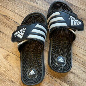 Adidas slip on sandals, black and white, moderate use, in good shape but didn't wear this summer.