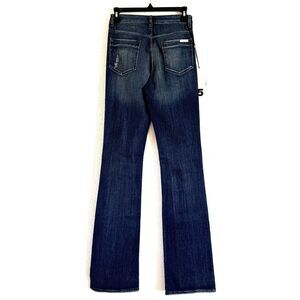 Hi-rise micro flare denim in a vintage wash with abrasions and whiskers. Featuring 5 pocket styling with single button closure and zip fly.