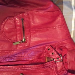 a very sassy red leather jacket complete with many pockets and edgy sewlines/zippers; new condition & thick, warm material