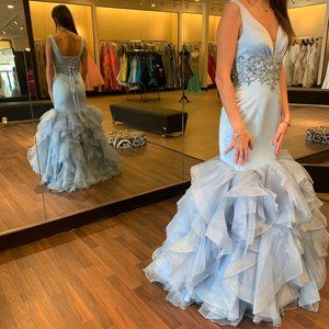 satin deep v-neckline with sheer mesh panel and beadwork on midriff, and corset with ruffle at bottom