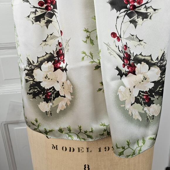 Winter themed holly, berries, and white floral polyester satin scarf measures 11" x 59".