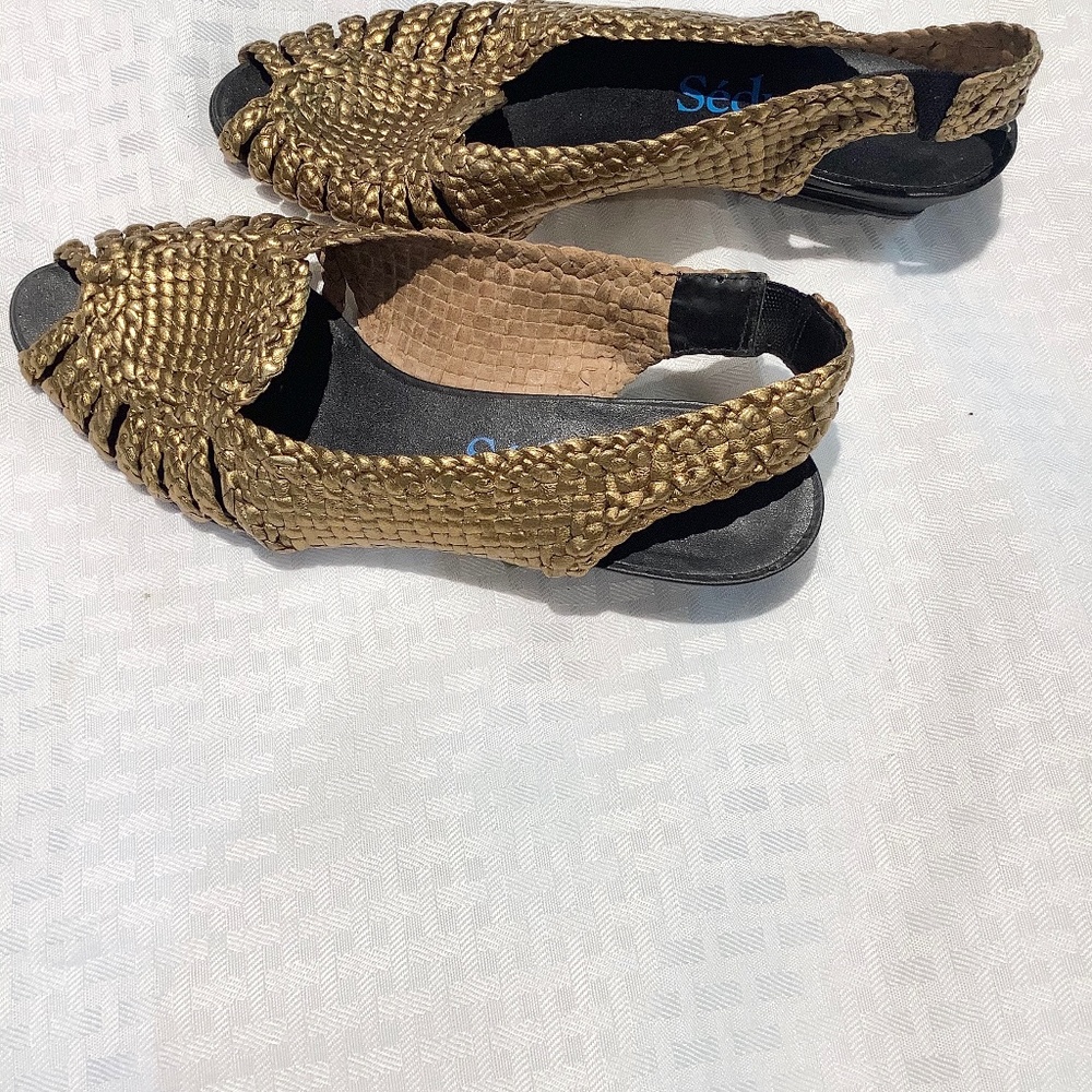 A great pair of sandals in a goldish/bronze color. Leather is extremely soft and in great condition . Wear on bottom but to be expected . A black short elastic band on side that masked them easy to pull on.. There is no size showing that I can read. The front of the shoe to back heel is 10 inches and the width at the front is around 3 1/4 inches wide...