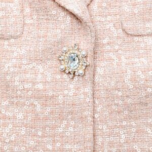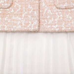 A lesson in artful contrasts, this dress marries the soft structure of sequinned bouclé with a light-as-air chiffon skirt. Match the sparkle of its diamanté buttons with our statement earrings.