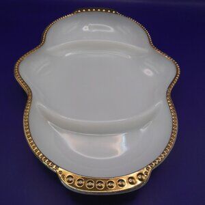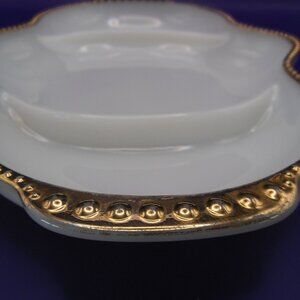 serving relish dish Anchor Hocking milk glass Fire-King hobnail and gold trim