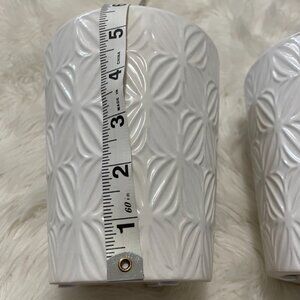 (set of 2) 6" Tall, 5" opening, 4" base Textured pattern glossy ceramic planters, ivory/off-white color, purchased for the plants they contained, unused, but one does have a small chip at top shown in pictures