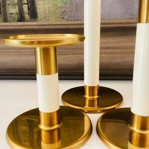 Set of 3 discontinued candle holders by IKEA. Gold metal finish with ivory center. The candle holders can be used with tapered candles or 3” diameter pillar candles (not included). Gently used condition, no marks or flaws, a couple of holes in the soft foam backing at the bottom of 2 candles.