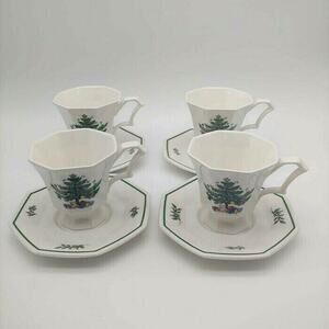 set of 4 Nikko Christmastime Footed Coffee Cup/Mug & Saucer Christmas Tree Holly