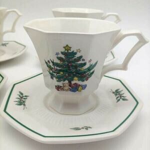 Set of 4 Nikko Christmastime Footed Coffee Cup/Mug & Saucer Christmas Tree Holly