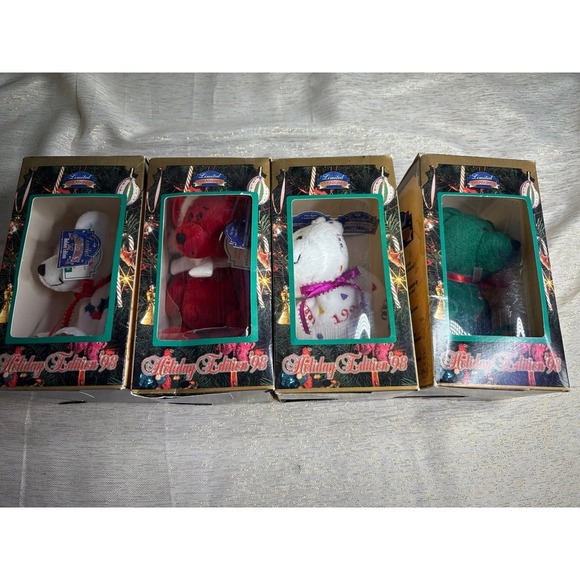 set of four "Limited Treasures Holiday Edition '98" collectible bears in their original packaging. These bears were released in 1998 as part of a holiday series.