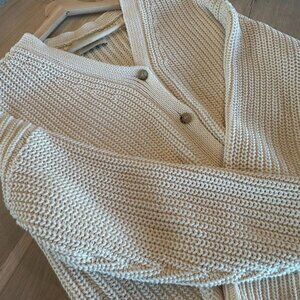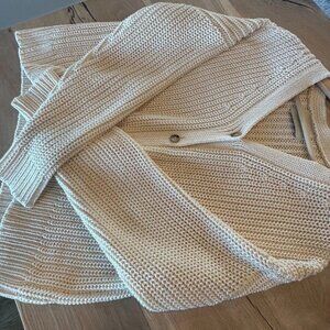 A classic cardigan shape featuring a softly draping organic cotton yarn in a rib knit pattern with corozo horn buttons at the front placket. Hand wash cold and lay flat to dry. Use gentle detergent or green dry clean. Knitted style great for summer. Slightly oversized fit, flowy.