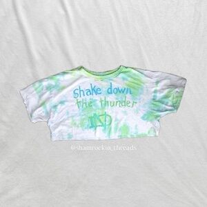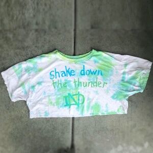 “shake down the thunder” destroyed-style Notre Dame tie dye crop top, size large