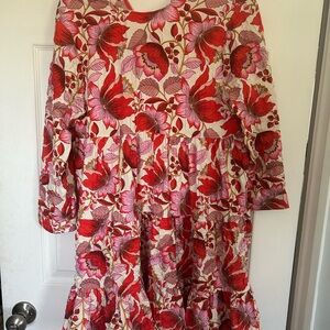 Vibrant floral dress with long sleeves. Features a mix of red and pink hues.