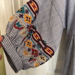 Blue and white plaid with the most gorgeous embroidery on the full, puffed sleeves.