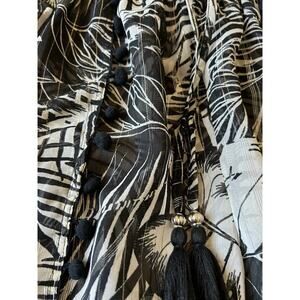 This product is a stylish and whimsical black metallic swimsuit cover up with tassels, designed for beach, pool, or swim occasions. The chiffon fabric and elastic waist offer lightweight comfort, while the wide-leg harem style is perfect for a boho or Fairy look. The pants feature gold thread lace accents, pom pom details, and a high-rise waist, making them a trendy addition to your summer or spring wardrobe. Made by Club Z Collection, these pants are machine washable and easy to care for, adding convenience to your beachor poolside ensemble.