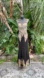 this amazing dress starts out with a sheer top. There are two layers of nude layer and a black layer. The dress is not sure where it has been heavily over embroidered with gold beating and iridescent jewels. There are insect cops because you can’t really wear a bra with this sheer dress. The skirt is a solid black with that embroidery extending below.Dress has plenty of stretch. It fits close to the body and then trumpets out at the hem with a slight train at the back. In excellent condition.