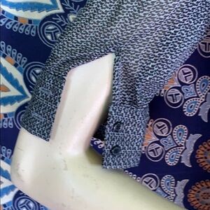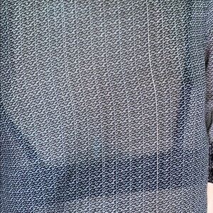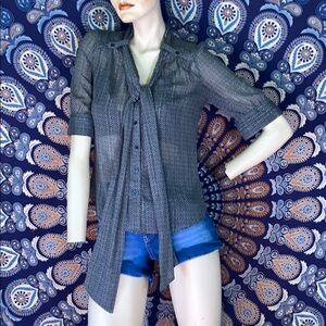 French connection brand size extra small black gray and silver sheer top button and tie front button cuff sleeves black and gray sheer pattern with silver pinstripes lightweight super flowy good used condition please see pictures