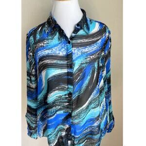 sheer tropical Women’s Blouse sea blue ocean vacation long Sleeve resort wear L