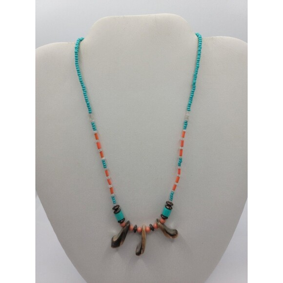 Add a pop of color to your outfit with this beautiful and unique shell and beaded necklace choker. The necklace features a combination of orange, turquoise, brown and white, which will complement any outfit. The main Bead color is turquoise with secondary beads in Orange, making it a perfect match for those who love the turquoise hue. The necklace is made of high-quality shell material and is perfect for any occasion.