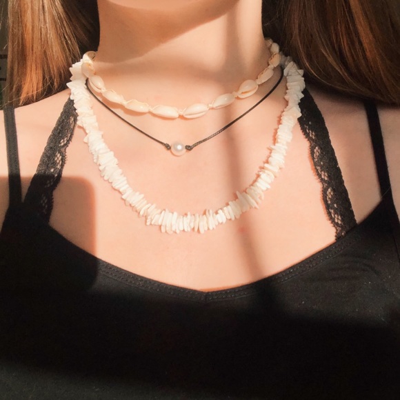 bundle of shell necklaces! in great condition. includes cowrie shell, puka shell, and pearl choker.