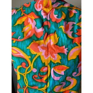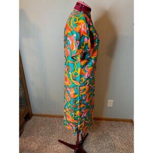 boat neck, shift dress with ruffle sleeves and super groovy psychedelic floral print. orange blue yellow and green.