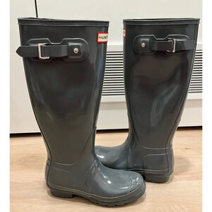 shiny gloss grey knee high tall hunter rain boots adjustable back, size 5/36