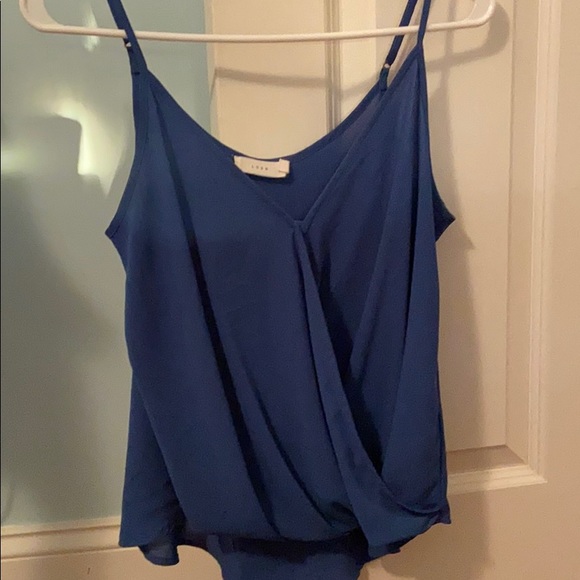 Blue blouse tank top that is very light and comfortable. Has adjustable straps and a button in front. Has a v-line cut and is a tad longer in the back.