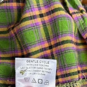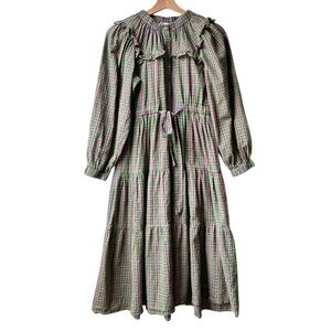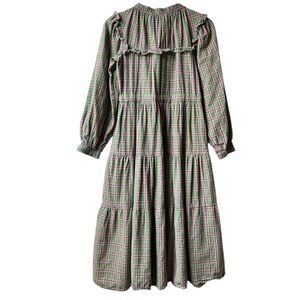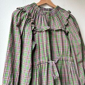 shirt by rochelle behrens Green Pink Flannel Plaid Ruffle Long Sleeve Dress Sz S