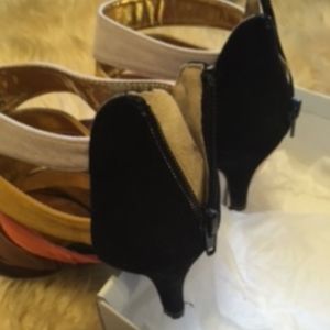 ankle boot, multi color, ( brown, orange, gold, and tan) zipper in back, a 3.5 inch heel, closed toe, side material, in perfect condition, and no sole damage. Condition is like new