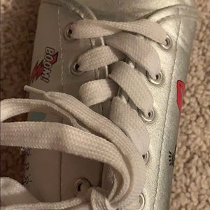 silver shoes with cute writing (xoxo, boom, pow)