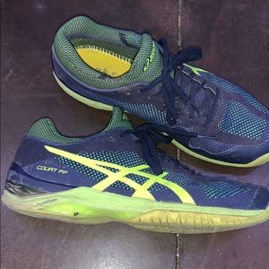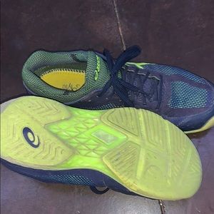mainly dark blue and neon yellow tennis shoes, a little worn but in good shape