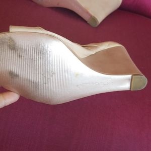 Beige BCBG Soft leather open toed shoes size 10B/40 with a 4 1/2 heel. Elastic on side and gathering down top.