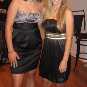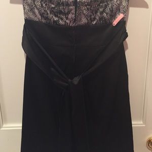 has been dry cleaned from the only wear it has ever had, grey and black snake skin pattern on top, all black with some roushing on the bottom, pockets, and ties in the back, dress on left in fourth picture
