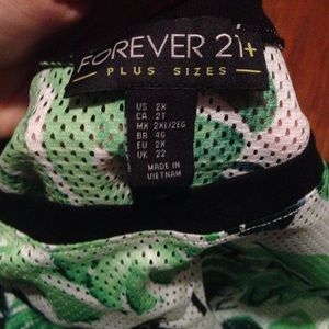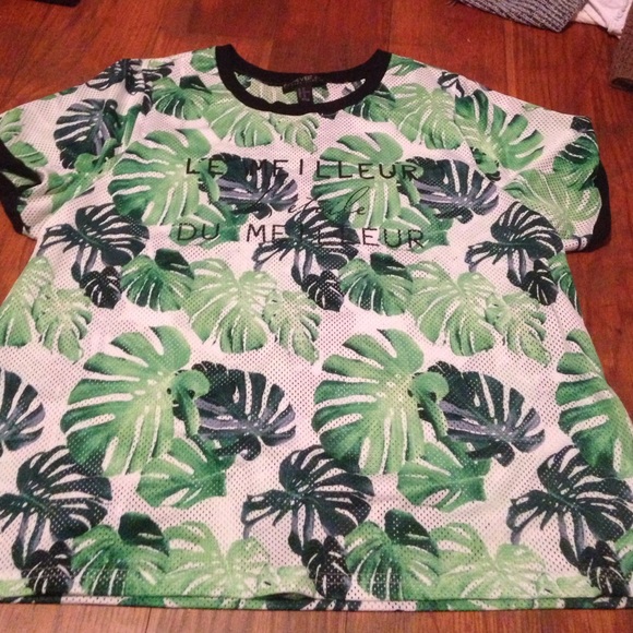 green leafy tropical print on a sheet athletic type shirt (can't think of the name rn) the saying says "le meilleur letoile du meilleur" which means the best of the best I think lol