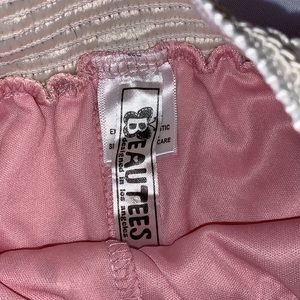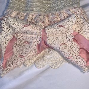 these are so cute that looks like a cute skirt but it shorts no showing your underwear and the monkey bars pink fabric covered with cream colored lace elastic stretch waist band